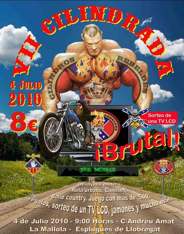El próximo 1 de Julio, CILINDROS REBELDES celebrará la próxima de sus CILINDRADAS. Este año será la 9ª, que promete ser aun mejor que la anterior. Desde las 9 de la mañana y hasta las 3 de la tarde, tendremos de todo. Desayuno motero, camiseta, ruta urbana, baile country, jamones, cazadoras de piel, equipos de música para moto, y como colofón, sortearemos también un televisor LCD. Ah, y el lugar inmejorable, con mesas y sombra donde disfrutar del mejor ambiente entre amigos. Y todo esto y mucho mas por solo 8€.