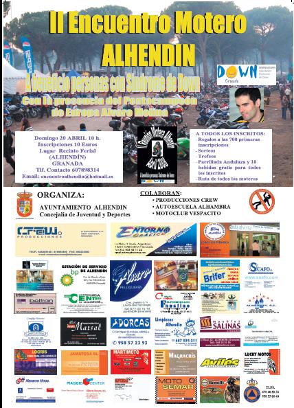 Debido a las inclemencias meteorológicas del pasado día 13 de junio, fecha del encuentro, se decidió suspender la concentración prevista, por lo que se pasa a la fecha que estaba prevista en caso de este supuesto. Por lo tanto, os invito a todos a que acudáis el 20 de JUNIO al recinto ferial de Alhendín a pasar un día de fiesta motera.