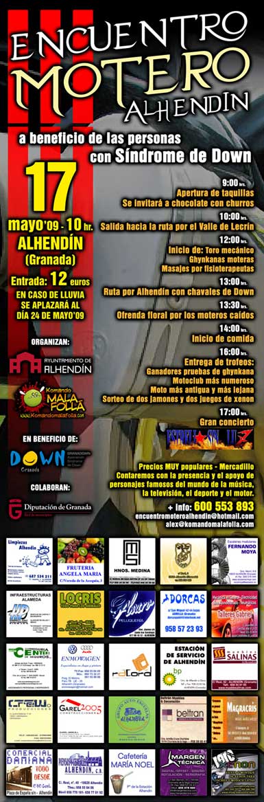 En esta ocasión, la tercera edición, la gente del Komando Malafollá nos hemos volcado y, junto al ayuntamiento de Alhendín, queremos darle un fuerte revulsivo para que se aumente la asistencia, las actividades y, sobre todo, el aporte económico para con DOWN, asociación granadina de personas y familiares de personas con Síndrome de Down, esa "enfermedad" que las hace especiales, pero no por la "enfermedad" sino porque las carga de bondad, alegría y ganas de vivir.