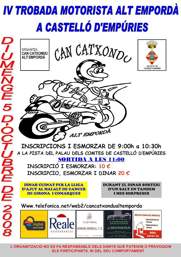 Encuentro, desayuno e inscripciones de 9 a 10:30h en el palacio de los condes de Castello d'Empuries ( Girona ) , a las 11 saldremos a rutear y pararemos a tomar un aperitivo en VENTALLO ( esto no lo pone el cartel) , La comida sera servida como cada año por la asociación de ayuda a los enfermos de cancer de nuestra zona, con quienes colaboramos desinteresadamente. Despues de la comida, y para celebrar nuestro V aniversario tendremos dos conciertos, uno acustico y otro ... Como vereis se trata de pasar un dia entre amigos, y a pesar de los impedimentos y la dificultad de montar un evento a un precio razonable por nuestras tierras (aqui cobran por todo) , creo que por quinto año consecutivo lo vamos a lograr . Ahora solo queda encomendarse al "Dios sol" y a la "madre Tramuntana" para que se dignen respetarnos en esta fecha tan señalada.