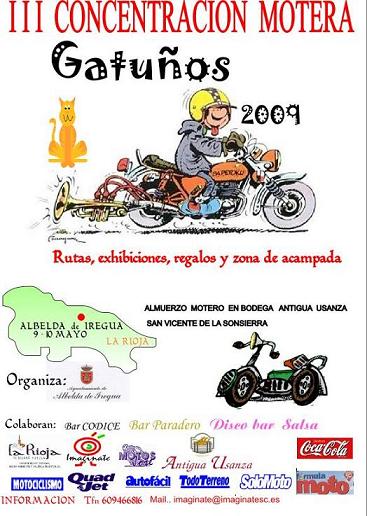 El Ayuntamiento de Albelda de Iregua junto a Imagínate SL organiza la “ V CONCENTRACIÓN MOTERA GATUÑOS 2011” los días 7-8 de mayo en ALBELDA DE IREGUA ( a tan sólo 12 Kms de Logroño). Desde estas líneas todos los moteros quedais invitados a la cuarta edición.