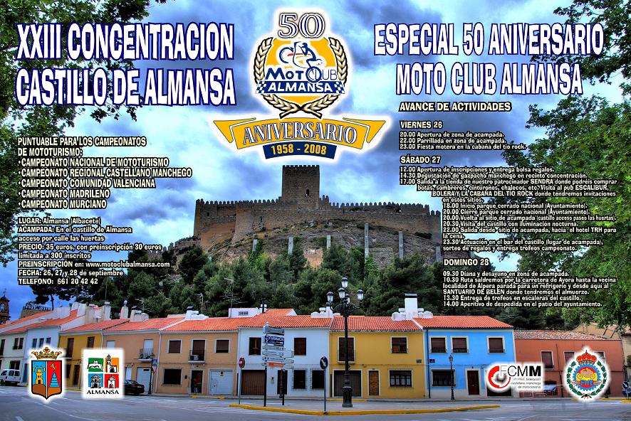 El Moto Club Almansa informa que el proximo dia 29 y 30 de septiembre del presente año, celebrará la XXII Concentración Castillo de Almansa que será puntuable para los campeonatos de Mototurismo: Campeonato Nacional de Mototurismocampeonato Regional Castellano Manchego Campeonato Comunidad Valenciana Campeonato Madrileño y Campeonato Murciano.