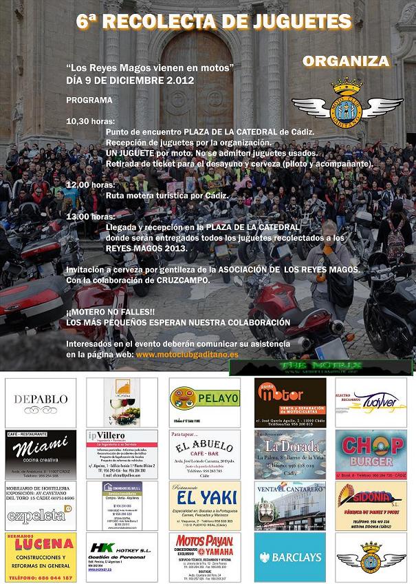 Estimados todos, por noveno año consecutivo el MOTO CLUB GADITANO demuestra su faceta más solidaria y se suma a la ilusión y el compromiso contraído con los niños gaditanos.Así, el próximo día 19 de DICIEMBRE, sábado (el domingo hay elecciones y habría problemas por tema de seguridad) nos volvemos a reunir en LA PLAZA DE LA CATEDRAL DE CÁDIZ para organizar la ya tradicional Recolecta de Juguetes “LOS REYES MAGOS VIENEN EN MOTOS”.