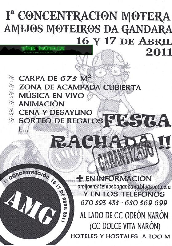 1ª Concentración motera del motoclub Amijos Moteiros da Gándara ( AMG ) se realizarán los días 16 y 17 de Abril del 2011 en Narón,A Coruña.Nuestro evento se encontrará situado en el aparcamiento del c.c. dolce vita Odeón la Gándara.empezaremos con la apertura de inscripciones el Sábado 16 de Abril a las 16h;a las 18h tendremos los juegos populares,a las 20h exhibicion motera infantil,21h cena,00:00h recuerdo a los caidos y comienzo del grupo musical BlackJack ( Un viaje por el mejor Rock de todos los tiempos )