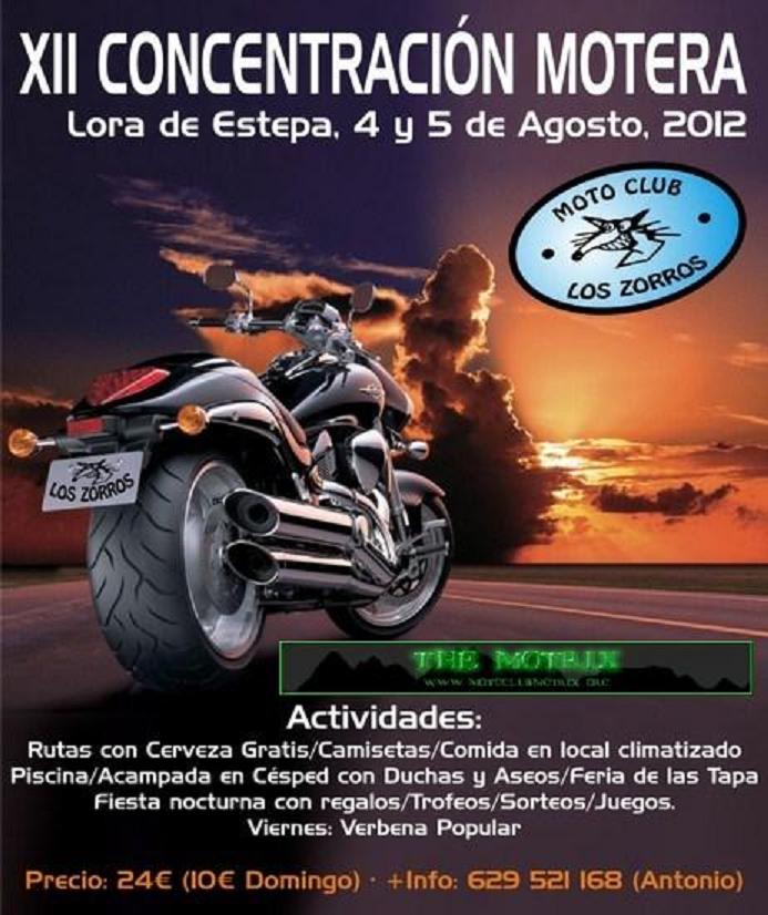 Si quieres pasar un fin de semana de lujo con tu moto acércate hasta Lora de Estepa (Sevilla). Allí, el Motor Club Los Zorros y Ayto. Lora de Estepa organizan una concentración motera Tendrás acampada en césped, rutas, fiesta nocturna, camiseta, trofeos, comidas en local climatizado...y por supuesto conocerás a otros que comparten tu afición por las motos. ¡Nos vemos!