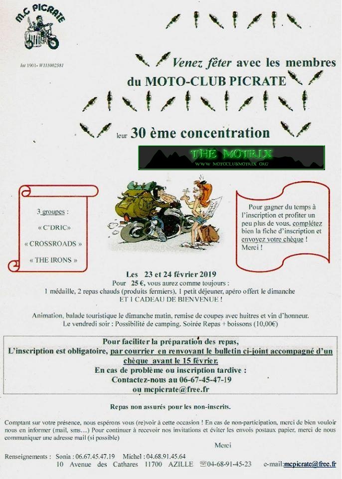 Lieu exact : Le lieu ne sera indiqué qu'à réception de la réservation ! Au Programme : Le Moto Club Picrate vous présente ses Meilleurs Voeux 2011 et vous invite à sa 22ème Concentration les 26 et 27 février 2011. Pour 20 euros, vous aurez : 1 médaille, 1 petit-déjeuner, 2 repas chauds, 1 apéro, animation, Balade touristique, remise de coupes. Possibilité de camping le vendredi soir : nous prévenir. Pour faciliter la préparation des repas, l'inscription est obligatoire, uniquement par courrier en renvoyant le bulletin d'inscription accompagné d'un chèque avant le 20 février. En cas de problème, contactez nous au 06 67 45 47 19. Repas non assurés pour les non-inscrits, lieu du Rassemblement indiqué après inscription. Comptant sur votre présence, nous espérons vous (re)voir à cette occasion. Si vous ne pouvez pas venir, pouvez-vous nous renvoyer un petit mail de non participation ? Merci. Gracias. ATTENTION : CETTE CONCENTRE EST UNIQUEMENT SUR RÉSERVATION PAR MAIL, COURRIER OU PAR TEL AU 06 67 45 47 19 . Tarif : 20 euros . Renseignements : (Sonia) 06 67 45 47 19 ou (Tito) 04 68 78 35 15 ...