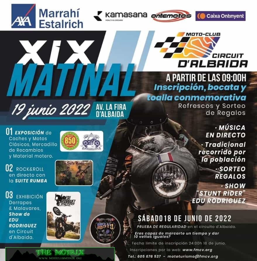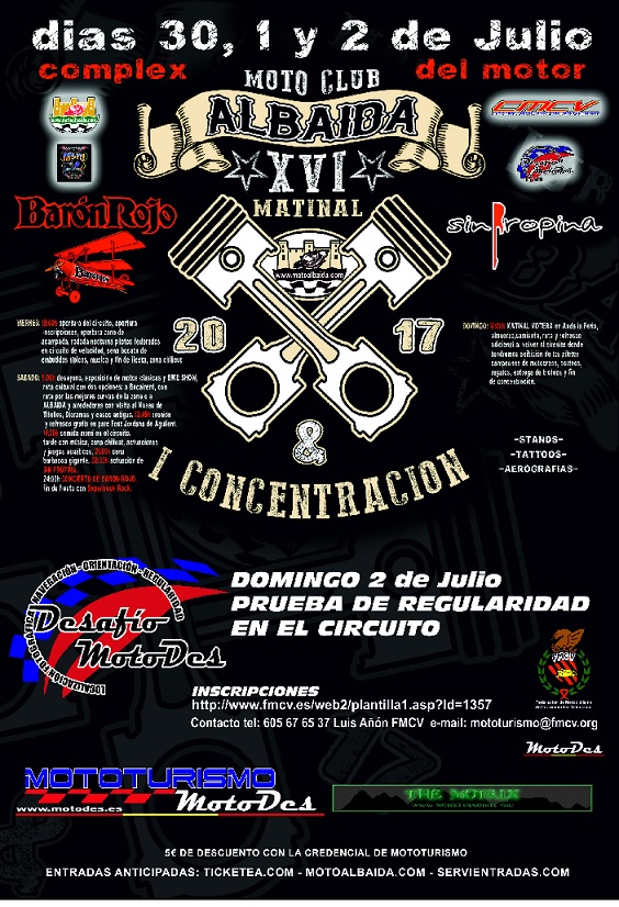 Estimados amigos , desde el Motoclub Ciutat d’Albaida estamos preparando la que será nuestra primera concentración motera , después de haber realizado 15 matinales, la base principal de esta concentración será el Complex del Motor de Albaida, que sin duda es el emblema y orgullo de este club.
