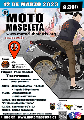 El próximo sábado día 12 de marzo celebraremos la VI Motomascletà del Club Mototurismo de Valencia en Torrent!! Este año cambiamos de ubicación y celebraremos esta VI edición en nuestro pueblo, Torrent.