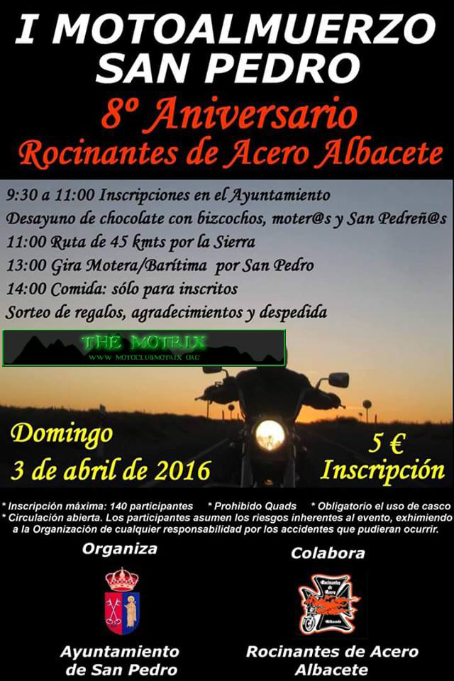 Comunicaros, que si vivís a más de cien kilómetros de San Pedro y prevéis que podéis llegar un poco apurados de tiempo para estar antes de las 11:00 de la mañana, o teméis que llegando poco antes de las once os quedéis sin inscripción ni camiseta (450 ambas), podéis reservar la inscripción mandando un mensaje de whatsapp la misma mañana del domingo 28, una vez que os vayáis a poner en marcha (SÓLO LA MISMA MAÑANA DEL DOMINGO) al 626 507 596 (SÓLO MENSAJE DE WHATSPAPP) indicando vuestros datos y la talla o tallas de camiseta que usáis.