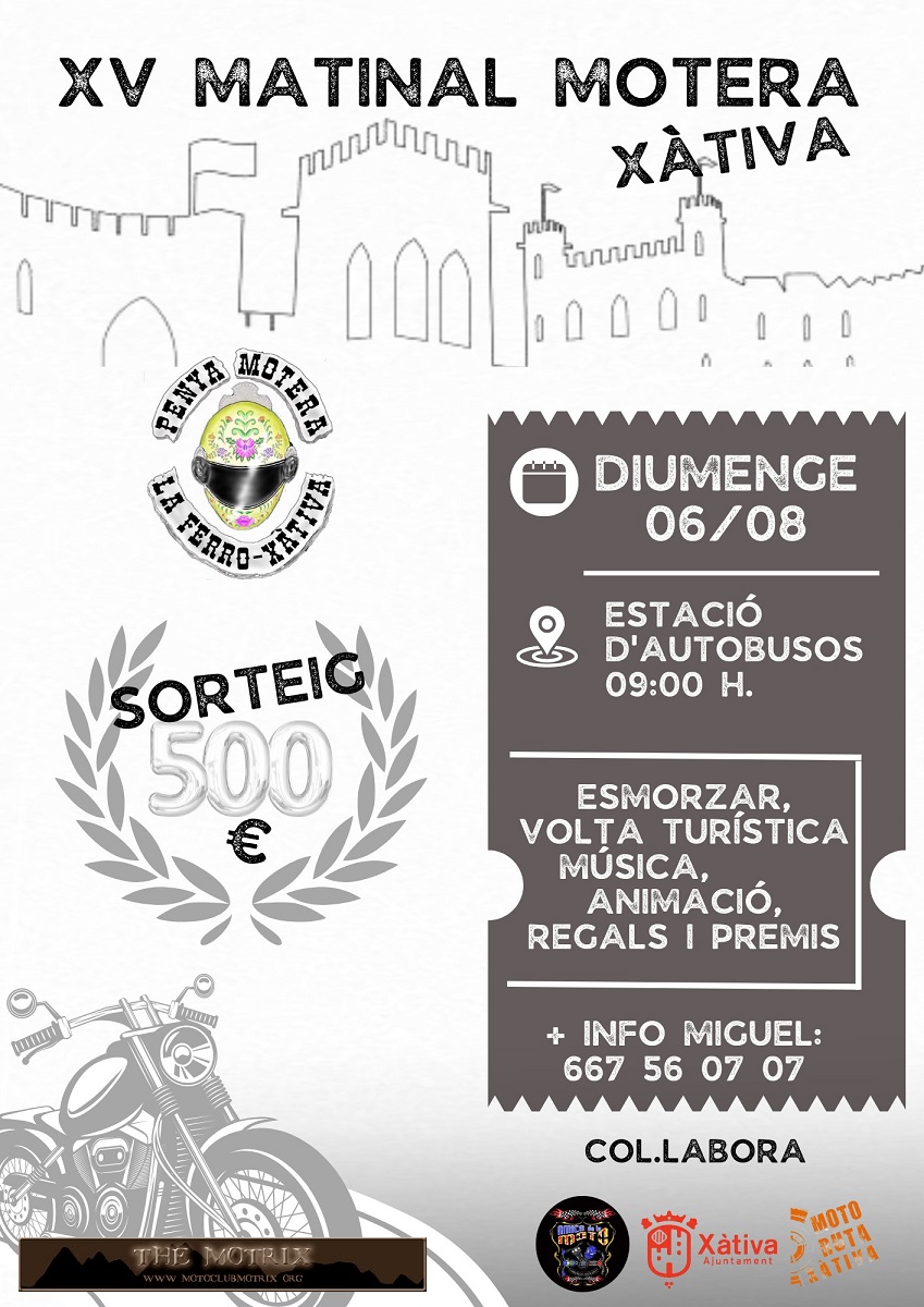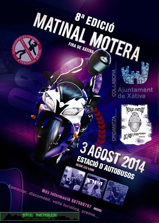 IV Matinal Motera Fira d'agost 2010, lugar estación de autobuses de Xàtiva, 9 h. Almuerzo, Vuelta turística, exhibición acrobática Maroto Team, discomobil,Camisetas, gorras, regalos, sorteos, trofeos i mucha fiesta.