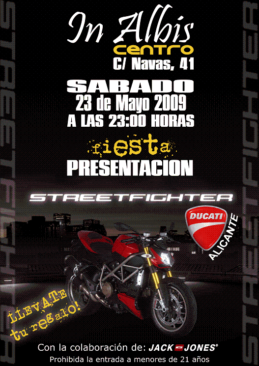 Ducati Alicante, tiene el placer de invitaros a la presentacion de la nueva Ducati Streetfighter 1100, que se celebrara el proximo sabado 23 de mayo en el Pub In Albis Centro, situado en la calle Navas de Alicante