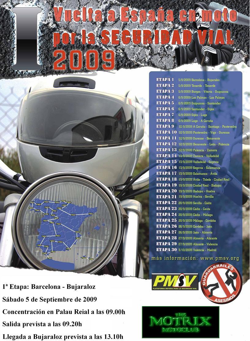 Comenzando en Barcelona el día 5 de Septiembre y finalizando en Madrid el día 3 de Octubre, la "1ª Vuelta a España en Moto para la Seguridad Vial", se realizará mediante etapas entre nuestras delegaciones, encabezadas por cada Delegado de la Plataforma Motera Para la Seguridad Vial en su Provincia, pasando el testigo al siguiente Delegado de la Provincia donde concluya su etapa. Realizaremos encuentros entre quienes finalizan una etapa y comienzan la siguiente, habiendo cursado previa comunicación a las autoridades locales para el desarrollo de cada uno de estos encuentros.