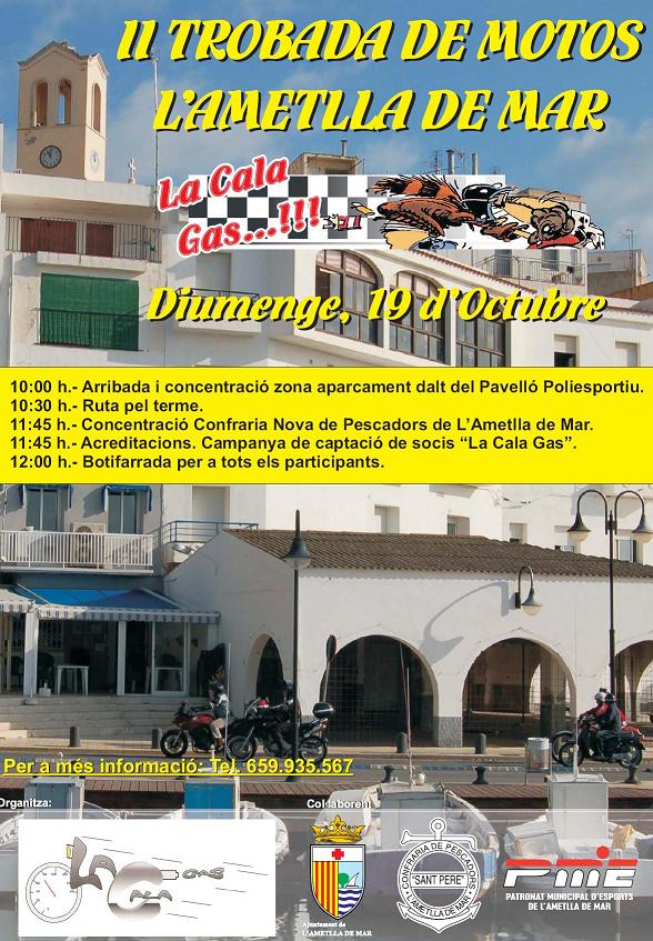 El proper diumenge 11 d' abril, La Cala Gas organitza la primera botifarrada de l' any coincidint amb el començament de la temporada de Moto Gp.La trobada serà el mateix diumenge a les 9:00 del matí a la llotja del port pesquer,allí podrem esmorza,(de 9:00 a 10:30), i agafar forces per fer una ruta motera pel poble i volt.