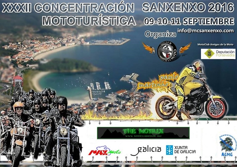 Gracias por vuestra paciencia por la espera de la confirmación de la fecha, pero ya es definitivo que nos veremos en los días 09, 10 y 11 de Septiembre de 2016 para disfrutar de nuestra pasión, en la XXXII Concentración Moto turística Internacional Sanxenxo 2016.
