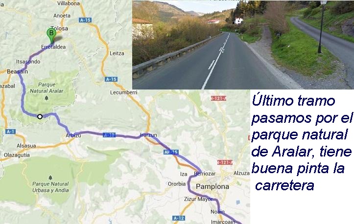 Bruc, Balaguer, Camarassa, Tremp, Puente de Montañana, Benabarre (podríamos para al desayunar en el bar de siempre, hay unos 200km), Graus, Ainsa, Boltaña, Sabiñanigo, Jaca, Yesa, Pamplona, Iruzun, Arbizu, Beasain y Alegría de Oria