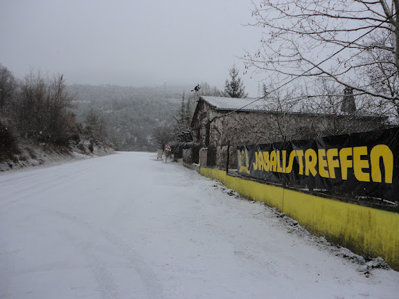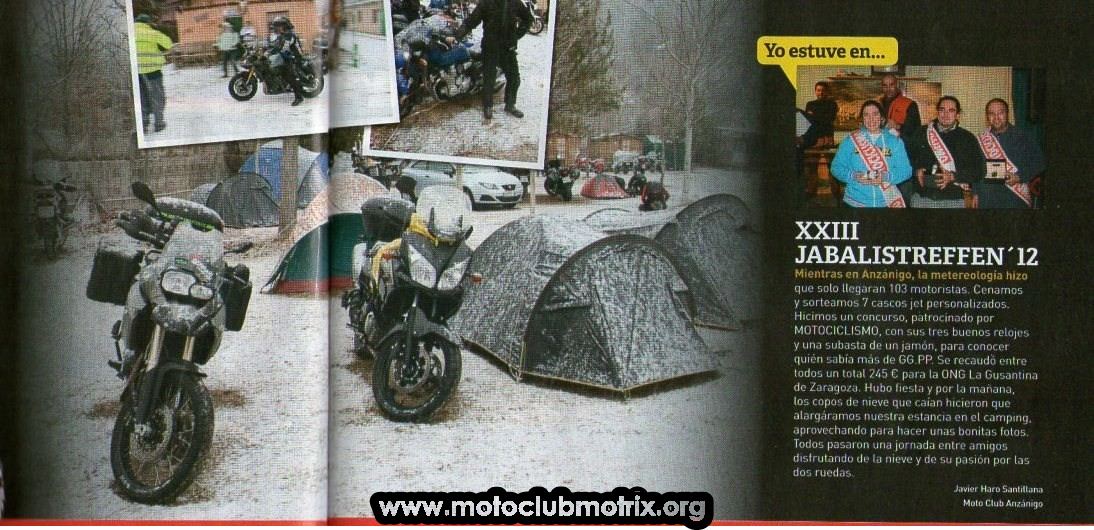 …igualmente nos fuimos a desayunar, huevos fritos con chorizo o longaniza. Muy buenos. Continuaba nevando!!, nos ponemos a recoger las tiendas y cargar las motos para salir lo antes posible…. algunos moteros empiezan a salir. En el tiempo que tardamos en recoger y cargar las motos, ha caído mucha nieve y además con hielo. Salimos a ver cómo está el estado de la carretera a pie. Nos comunican la organización que todos los que han salido están tirados en la carretera, pues está la carretera en muy mal estado. Más tarde llega la guardia civil, y nos a conseja a no abandonar el camping hasta que venga el quitanieves…. pero no saben a qué hora podrá pasar … pues primero tienen que habilitar las carreteras nacionales más transitadas. Pues nada a esperar ….. Después de unas 2 horas aproximadas, aparece el quitanieves y nos comunica que la carretera esta aun en mal estado y que hay todavía compañeros nuestro tirados en la carretera. Al cabo de un rato comienza a llover y decidimos prepararnos para salir. El paisaje es todo blanco, muy bonito para realizar fotos, pero muy malo para circular a dos ruedas…. desde el camping hasta el pantano de la Peña la carretera estaba con restos de nieve, pero gracias a la lluvia pudimos salir de allí. Una vez en Ayerbe nos paramos a comer y luego más tarde continuamos camino para casa….. nos informan que en Esparraguera está nevando….. que suerte la nuestra!. Viajamos de Lérida hasta llegar a casa a una temperatura de -4ºC. Al llegar a casa me metí en la ducha con agua muy caliente durante una hora. Y esto ha sido todo, aunque parezca malo, para nosotros ha sido una aventura digna de repetir. En general no lo pasamos muy bien, tanto en carretera como en la concentración, buen ambiente, buena gente, aunque debido al tiempo muchos se quedaron en casa… aun así asistimos bastantes, menos de los 200 esperados, ceo recordar que unos 130 moteros.