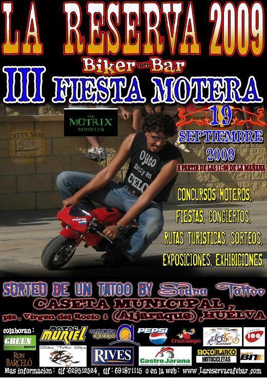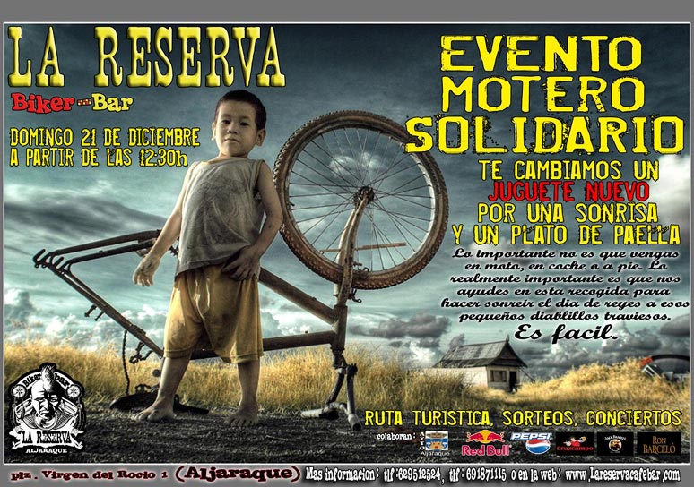 En primer lugar informaros que este evento es muy importante para nosotros, ya que es la primera vez que vamos a hacer este tipo de evento solidario. este evento se va a crear tambien en http://www.tuenti.com (podeis agregarnos como amigo, nuestro nombre en tuenti es la reserva biker bar) por lo que os agradeceria que le dieramos entre todos la mayor difusion posible, ya sea por tuenti, por e-mail, por webs moteras o por el simple boca a boca. Pero que lo difundais a todos vuestros contactos y amigos. En breve colgaremos en http://www.lareservacafebar.com mas informacion del evento y ante todo GRACIAS POR VUESTRA AYUDA.