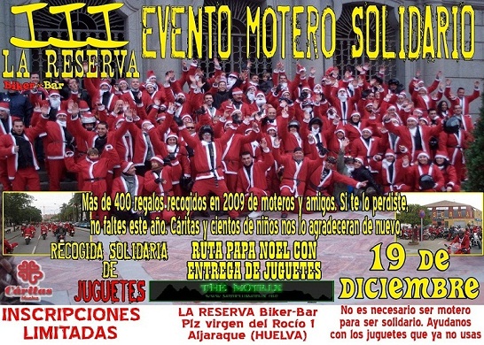 Por CUARTO año, vamos a realizar una RECOGIDA DE JUGUETES SOLIDARIA, ya el año pasado conseguimos MAS DE 450 REGALOS. Posteriormente realizaremos una RUTA DE PAPA NOEL con destino la sede de CARITAS EN HUELVA. El año pasado contamos con la colaboracion de CANAL SUR Y CADENA CIEN Y HUELVA INFORMACION entre otros. Asi que ya sabes ve buscando esos juguetes en buen estado que tu hijo ya no usa y unete a este evento.
