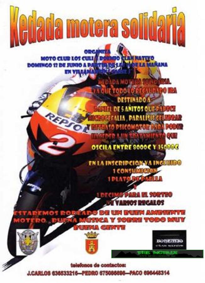 kedada motera solidaria que organiza el moto club los culi y bohemio clan nativo el día 12 de junio a partir de las 11 de la mañana, la inscripción será de 3€ en la cual incluye una consumición un plato de paella y un numero para innumerables sorteos entre ellos varios cascos, guantes, camisetas, gorras, relojes, etc....
