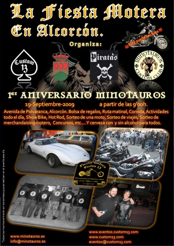 Celebramos varias cosas, el primer aniversario de Custom13, el primer aniversario de Custom Club Minotauros, la segunda fiesta en Piratas de Alcorcón, vamos, un chorro de cosas que esperamos por parte de los organizadores, las disfruteis como os mereceis.