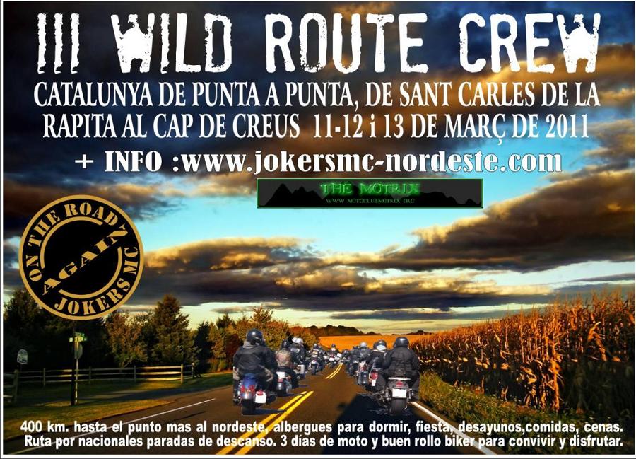 El wild route crew se celebrará durante los días 5-6-7 de Marzo de 2010 y su inscripción es limitada para las camas disponibles en el lugar elegido para pasar las noches. En todo momento se respetaran las normas de circulación vigentes y adecuaremos nuestra forma de conducir a las circunstancias del clima y de la vía por la que circulemos, no es una carrera, simplemente trataremos de circular en grupo y de vivir todos juntos unas jornadas únicas.
