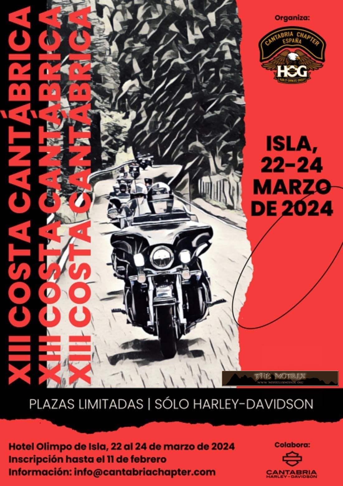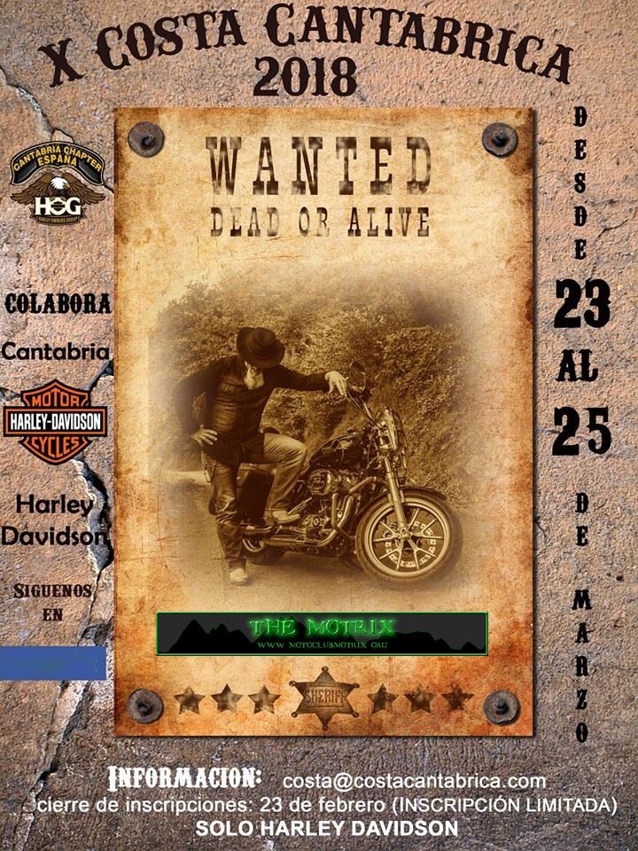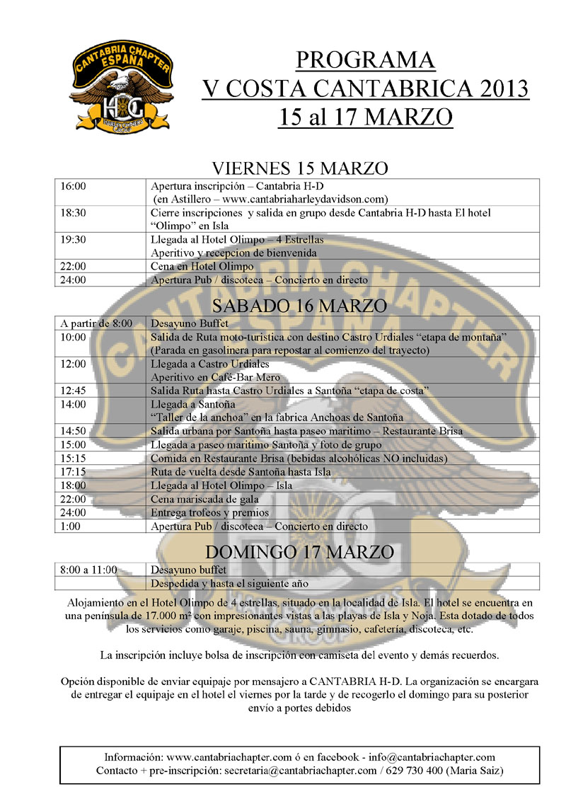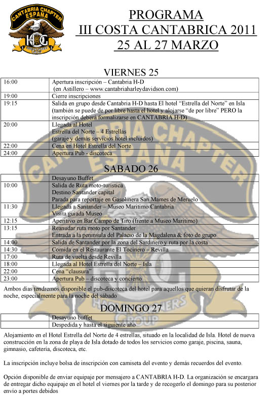 Evento anual del Cantabria HOG Chapter para propietarios de Harley-Davidson para disfrutar de un fin de semana entre amigos de la gastronomÍa, cultura, paisajes y rutas de Cantabria. En el hotel Olimpo con pensión completa, ruta moto-turística, conciertos de pop-Rock, música regional en directo y pack de preinscripción. Apertura de preinscripción a mediados de enero 2016 y cierre el 12 de febrero. Consultas y preinscripciones solo a traves del mail costa@cantabriachapter.com