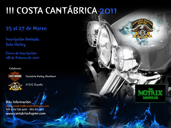 Cuarta edición del rally COSTA CANTABRICA y el primer evento del calendario anual del H.O.G. en 2012 (Harley Owners Group). Como en pasadas ediciones arrancamos motores de la nueva temporada cuando aun estamos recuperándonos del invierno de la mejor forma que todos conocemos. Buenas Rutas, Harleys, gastronomía, turismo, cultura y por supuesto los amigos con los recuerdos de la temporada pasada y los grandes planes para este 2012. Esperamos que esta edición cumpla las expectativas tanto de los que ya han compartido este rally anteriormente como de los que participen por primera vez.