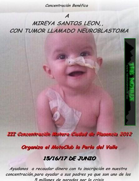 Hola amigos, este año hacemos nuestra concentración a beneficio de la niña de 1 año de edad MIREYA SANTOS LEÓN con cáncer llamado NEUROBLASTOMA, y queremos ayudar a sus padres ya que son unos de los 5 millones de parados que hay por culpa de la crisis, la niña se encuentra en el Hospital Materno Infantil de Badajoz