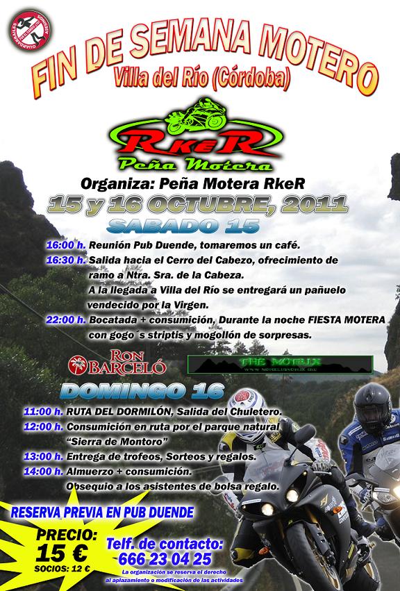 BUENO PUES AHORA NOS HA TOCADO A NOSOTROS OFRECEROS LA POSIBILIDAD DE CONOCER EL VALLE DEL GUADALQUIVIR Y SUS GENTES, Y COMO NÓ INVITAROS A UN EVENTO ALGO ATIPICO POR SU ORGANIZACIÓN PUESTO QUE REALIZAREMOS UNA ENTREMEZCLA ENTRE LO RELIGIOSO Y EL EROTISMO, ENTRE LA RUTA DE LARGA DISTANCIA 130 KM TOTAL Y LA CORTA 33 KM, ENTRE SIN ALCOHOL Y EL MUCHO ALCOHOL "SIN PILOTAR", ENTRE LA GRAN FIESTA MOTERA NOCTURNA Y LA RUTA "DEL DORMILON", CONOCEREMOS LA BOCATADA, CONOCEREMOS EL PARQUE DE LA SIERRA CARDEÑA Y MONTORO, CONOCEMOS EL CERRO DEL CABEZO SUPERANDO LOS 1000 METROS DE ALTITUD, CONOCEREMOS VILLA DEL RIO CON TODAS SUS CALLES LLANAS A EXCEPCION DE TAN "SOLO UNA CUESTA" EN TODA LA LOCALIDAD, Y LO MAS IMPORTANTE OS CONOCEREMOS A VOSOTROS QUE SOIS LOS VERDADEROS PROTAGONISTAS DE ESTE EVENTO, Y POR ESTO Y POR MUCHO MÁS OS ESPERAMOS !!!!!!