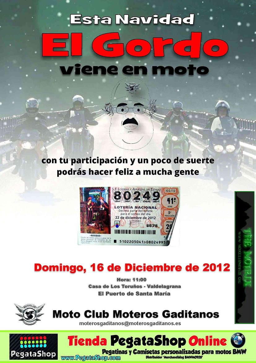 El Gordo viene en Moto es un acto benéfico en el cual aquellos particulares, motoclubs, foros moteros, asociaciones, empresa, etc. aportaran y depositaran un décimo de lotería para el sorteo de Navidad en una urna en el acto que se organizara para ellos. El premio de los décimo premiados será entregado a las Entidades benéficas que elijan quienes aporten el décimo de lotería.