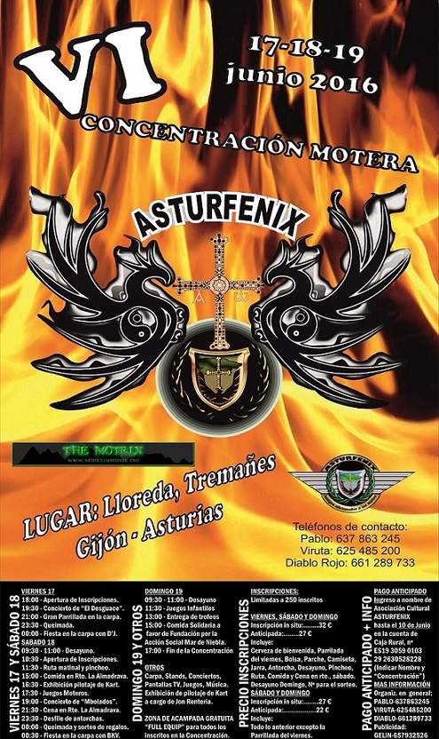 Un año más Asturfénix afronta con ilusión su VIII Concentración Motera, os invitamos a que vengáis a pasar un fin de semana de diversión y compañerismo con nosotros, este año con algunas novedades que os iremos desgranando poco a poco para que sepáis como serán. Como en ediciones anteriores la celebraremos en Lloreda, Tremañes (C/Marruecos), de momento sólo comentaros que tenemos las preinscripciones abiertas, podéis hacerla bien por ingreso bancario al número de cuenta Caja Rural nº ES19 3059 0103 29 2630528228 indicando: nombre y apellidos, club si es que perteneceis a alguno (si no omitir este paso) y los días para los que os inscribís.
