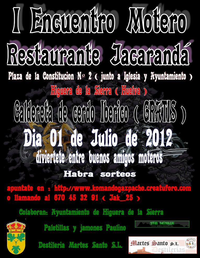 Hola compañeros, nuestro amigo Isaac, dueño del Restaurante Jacarandá en Higuera de la Sierra ( Huelva ) el dia 01/07/2012 tiene el placer de invitarnos gratis, a una impresionante caldereta de cerdo iberico, bebidas a precios anticrisis, cervezas, refrescos etc a 1€