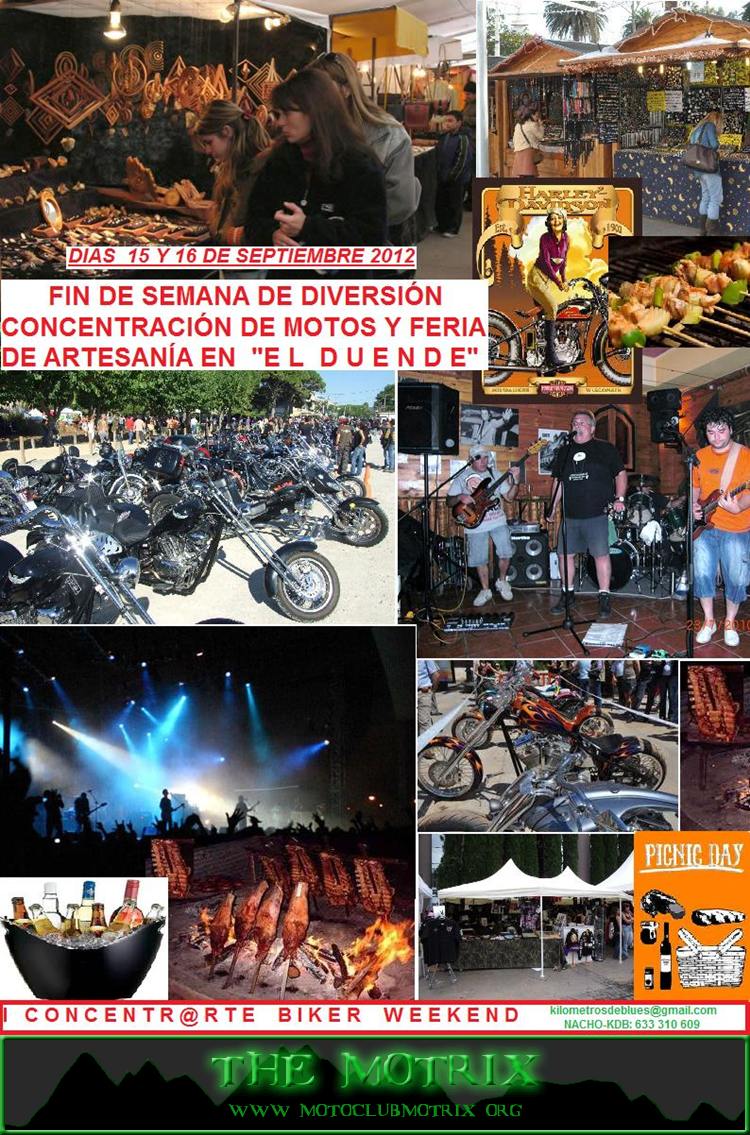 Hola amigos/as, mi nombre es NachoKDB y voy a explicaros de que va esto. Concentr@rte Biker Weekend es una fiesta dirigida a todos aquellos biker y ciudadanos de a pie, que les apetece encontrar algo nuevo en sus caminos. En esta fiesta vamos a hacer una fusión de lo que sería el Blues y Rock con el arte de artesanos cualificados para mostrarnos sus creaciones hechas en materiales como: el cuero, piedra, plata, alpaca, compuestos de minerales, resinas trabajadas a mano, y muchas mas cosas que estos señores y señoras se pasan horas y horas creando para que las personas con gusto como vais a ser todos vosotros podáis admirar y comprar si así lo deseáis agradeciéndoles, que hagan estas maravillas y no el producto “chino cochino” que ya huele, y nos tiene a todos hasta los chihuevos…también todos los asistentes vais a disfrutar de animación que otros artistas van a realizar para que disfrutéis todos como enanos, el arte de los animadores entrará en juego junto con los conciertos que va a haber de Blues&Rock y Funk. Todo esto va a ser acompañado con una parrilla encendida y humeante en todo momento abierta para todos aquellos que os apetezca comer buenos productos caseros del campo y la huerta como por ejemplo parrilladas de verdura, panceta, pollo, chuletas, longaniza, morcilla, salchichas alemanas y, lo que caiga en esas brasas, y para que los gaznates no se os resequen tendréis una barra con cervecita, refrescos y copas.
