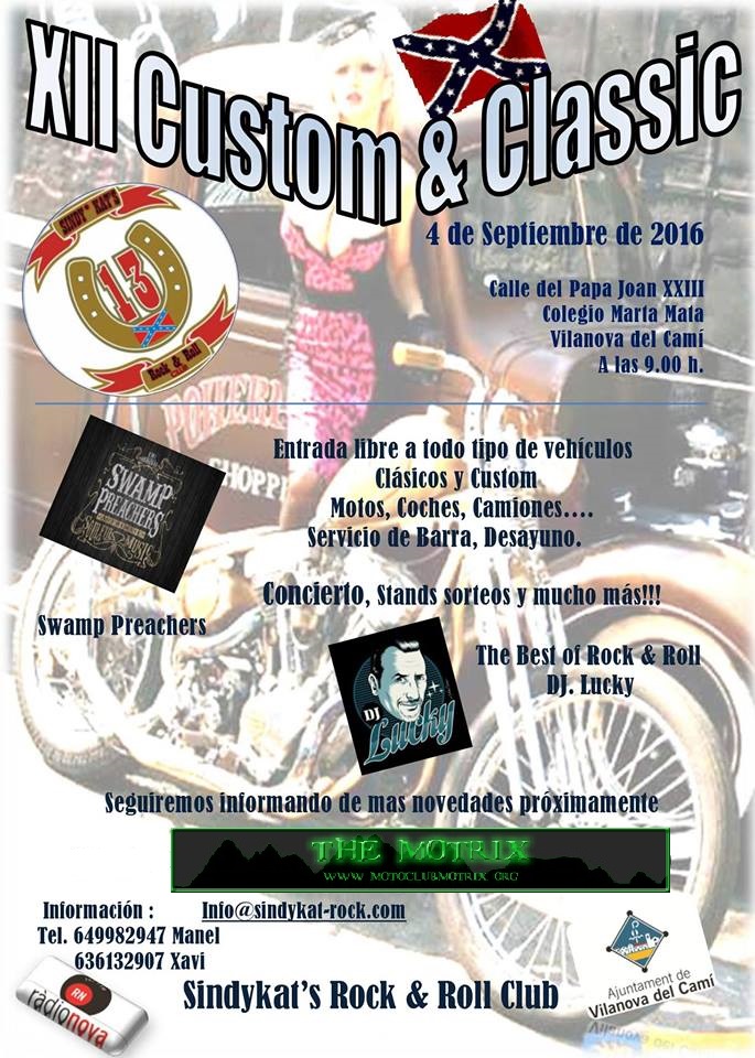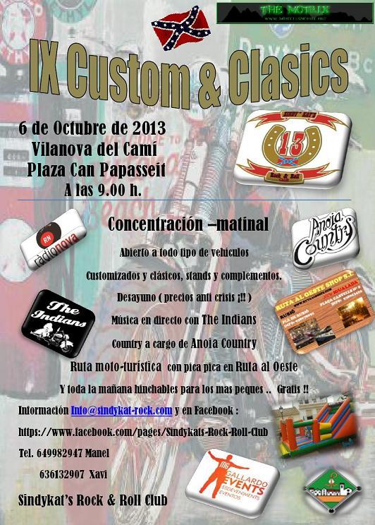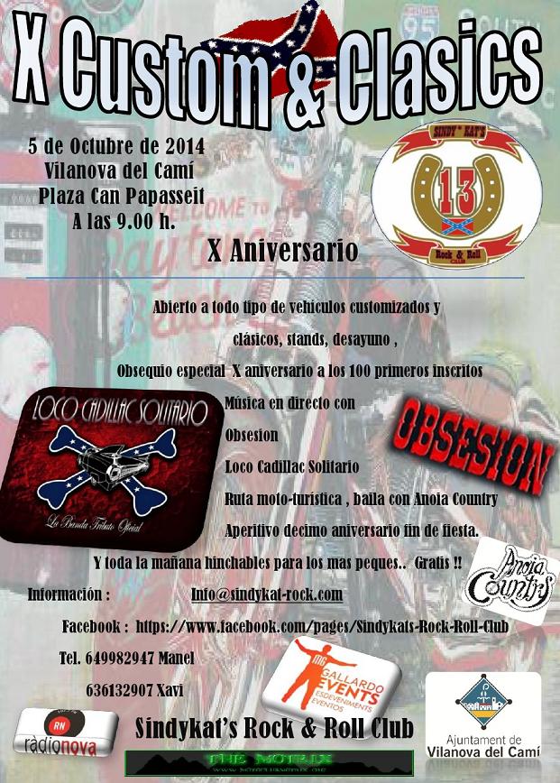 Ya volvemos con nuestro X Custom & Clasics.. 10 años ya!! que rápido pasan! y este año tenemos en primicia, en riguroso directo y gratuitamente a la banda tributo oficial a Loquillo, LOCO CADILLAC SOLITARIO !!! Todo un lujo...Y por si es poco para algunos pues en directo también a Obsesión ( rock & roll a tope ) ya podéis reservar esta fecha 5 de Octubre de 2014 en Vilanova del Camí, abierto a todo tipo de vehículos, desayuno económico, stands, música en vivo, country, obsequio décimo aniversario a los 100 primeros inscritos, ruta por la comarca, cerveza, sorteo obsequios entre los asistentes, pica pica fin de fiesta, castillo hinchable gratis para los niños, etc...