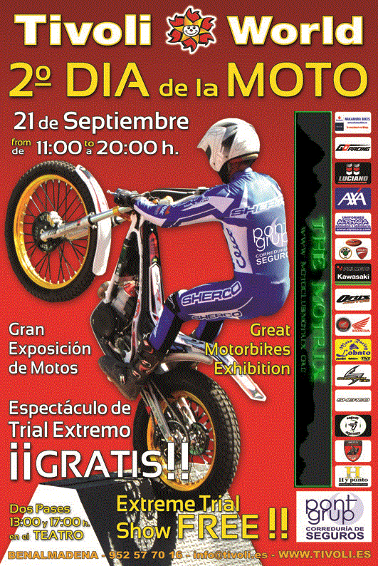 Tendremos exhibiciones profesionales del piloto Emilio Zamora y David Chavez (velocidad y Trial) ruta turística de clubes moteros, test de motos, zona comercial expositiva, música en vivo, sorteo de regalos, tatuajes, souvenirs....