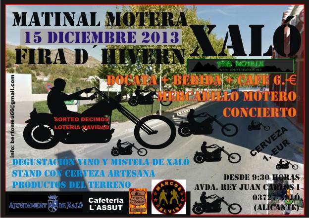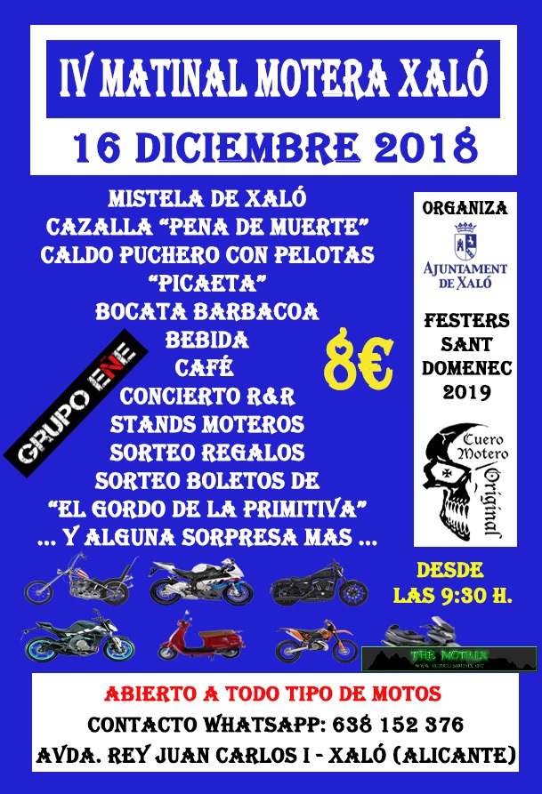 Desde las 9:30 de la mañana tendremos todo preparado. Barbacoa para almorzar, el café nos lo servirán en la mesa, Concierto de Marcos Elvis, Sorteo de regalos, Mistela de bienvenida y degustación de vinos de Xaló. Stands moteros, y stands con productos del terreno (dulces, miel, vino, etc.).