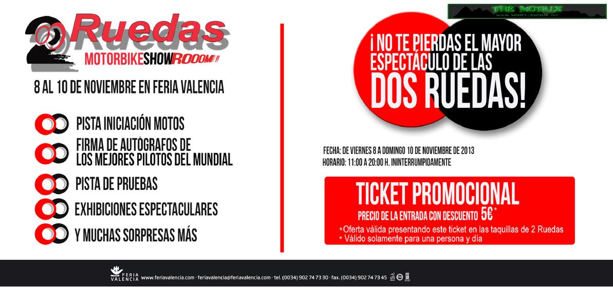 Las motos estarán de nuevo en Feria Valencia del 8 al 10 de noviembre con la reedición del salón 2 Ruedas, un certamen que retoma la filosofía y el nombre de aquel que se estuvo celebrando hasta 1996. En esta ocasión, se da la circunstancia de su coincidencia durante el mismo fin de semana con la celebración del Campeonato del Mundo de Motociclismo en el Circuit de la Comunitat Valenciana Ricardo Tormo. Con tal motivo, se espera que Valencia sea esos días toda una referencia mundial para el mundo de la moto.