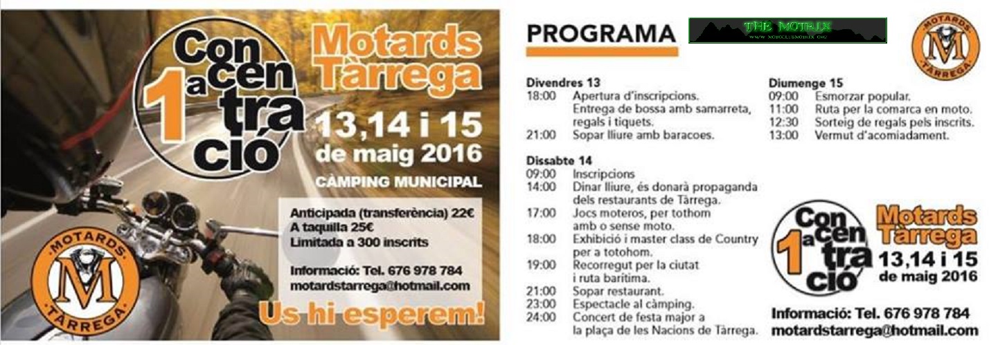 Desde que Motards de Tàrrega reemprendió la tarea de continuar con la concentración no había vuelto a Tàrrega por distintos motivos. Este año decidí que les debía una visita y el viernes a eso de las 6,30 para allí que me fuí. El viernes no había tradición de asistencia y así continúa, pero la organización, exquisita en todo momento, no nos dejó solos ni un momento. La inscripción, 20 € : camiseta tècnica a escoger, roja o negra, folletos informativos para hacer excursiones, dos regalitos de las casas colaboradoras, dos bolígrafos, unos caramelos, cerveza de bienvenida, cinco tiquets para la ruta barítima del sábado tarde, más la cena del sábado y desayuno, aperitivo y sorteo de regalos de domingo. Además, musica de los 60-70-80 a cargo de un dj que ambientó la velada. La posibilidad de asistir a los conciertos programados para la fiesta mayor. La organización, el sábado, tuvo el bonito detalle de convidarnos a cenar con ellos sin cargo alguno, un bonito detalle de esta família motera que son los motards de Tàrrega. No hay la masificación que había antes, y el evento se ha convertido en una reunión familiar muy agradable. El domingo además como antes el almuerzo es gratuito para los primeros 700 asistentes. Otro detalle importante son los precios populares de las bebidas, cerveza 1/3 de barril a 1€. En fin un bonito fin de semana pasado por agua pero que no deslució para nada la gran voluntad de este motoclub. Gracias Motards de Tàrrega.