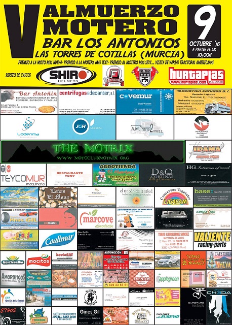 Ven a disfrutar de nuestro IV ALMUERZO MOTERO BAR LOS ANTONIOS, con cerveza, gran variedad demontaditos (pvp 1€), recinto con carpas, la mejor musica y el mejor ambiente.