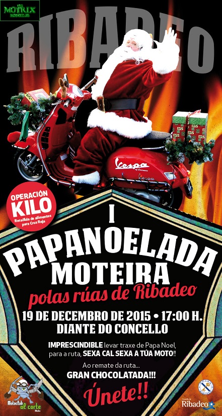 En la tarde del sábado 19 a partir de las 17:00 Horas tendrá lugar la I PAPAPANOELADA MOTERA por las calles de Ribadeo, consiste en recorrer las calles de Ribadeo en MOTO vestidos de Papa Noel, tirando caramelos a los niños para luego al terminar degustar de una Gran Chocolatada.
