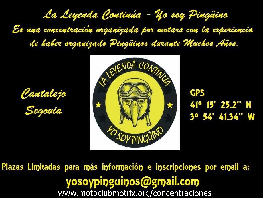 Los organizadores de Pingúinos constituidos en un nuevo moto-club, La Leyenda continúa - Yo soy Pingüino, iniciamos una nueva etapa y un nuevo proyecto, con la Concentración del mismo nombre: "La Leyenda continúa - Yo soy Pingüino" en Cantalejo (Segovia), que se celebrará los días 8/9/10 de Enero de 2016.