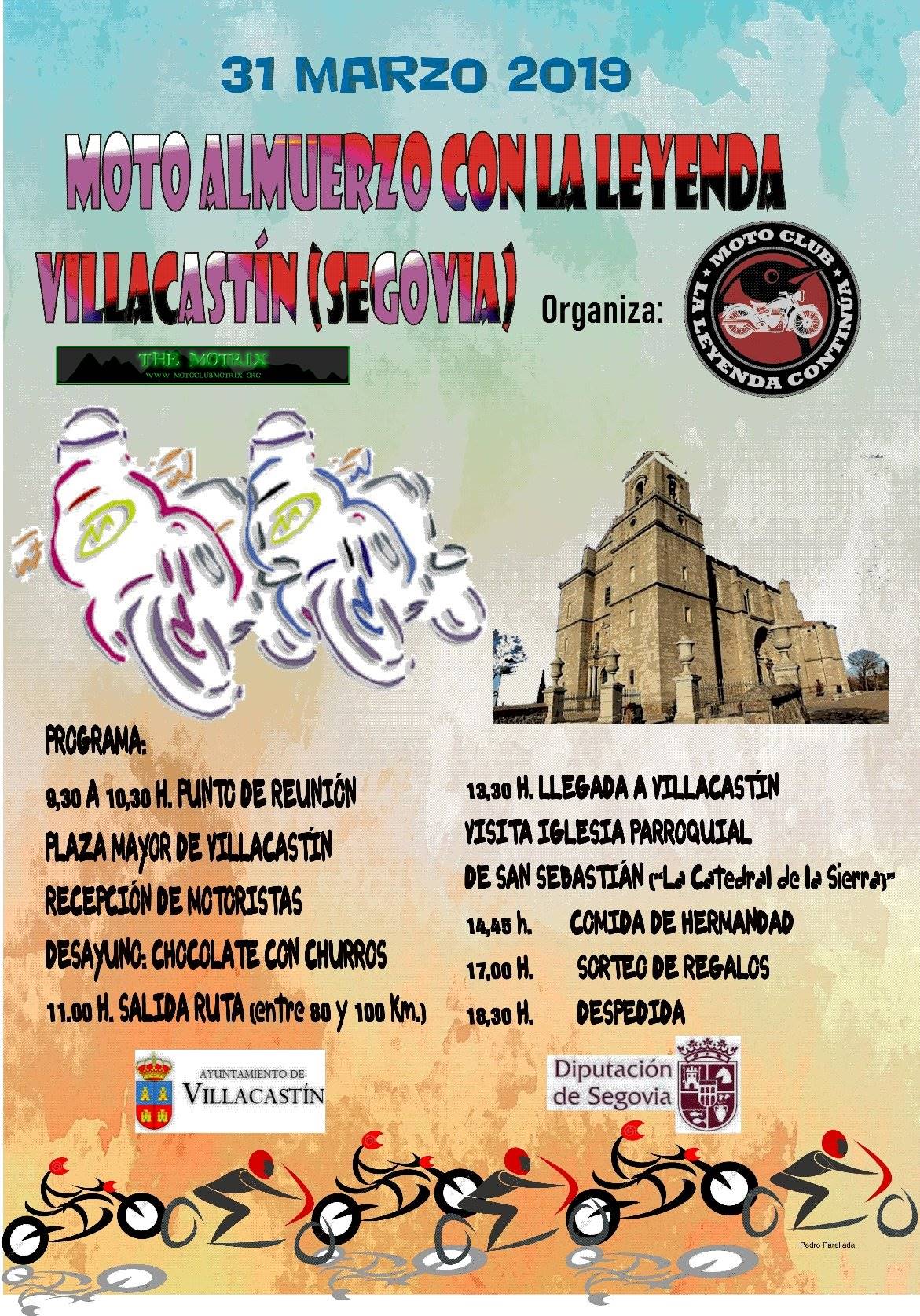 Tres años después del Encuentro de la "Luna Llena Motera" de Villacastín, el Club de Moto La Leyenda Continúa convoca en esta villa segoviana una reunión para sus fieles amigos. Una jornada de convivencia, con un programa muy atractivo. A primera hora de la mañana se disfrutará de un desayuno antes de salir a realizar una corta, pero muy interesante ruta por la zona, para regresar a Villacastín y realizar una visita antes de La comida de hermandad.