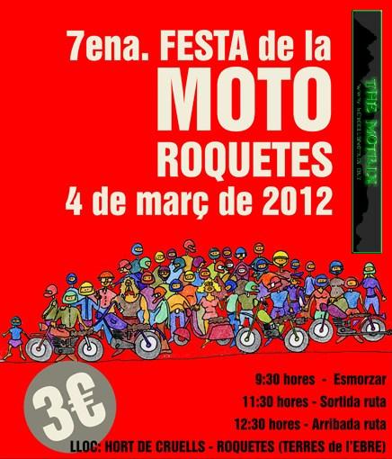 El próximo domingo 3 de marzo organizamos la 8a. Festa Popular de la Moto en Roquetes. Esta Festa está abierta a todo tipo de ciclomotores y motocicletas. El lugar de la concentración será a las 9:30 horas en el Hort de Cruells (Roquetes-Tarragona).