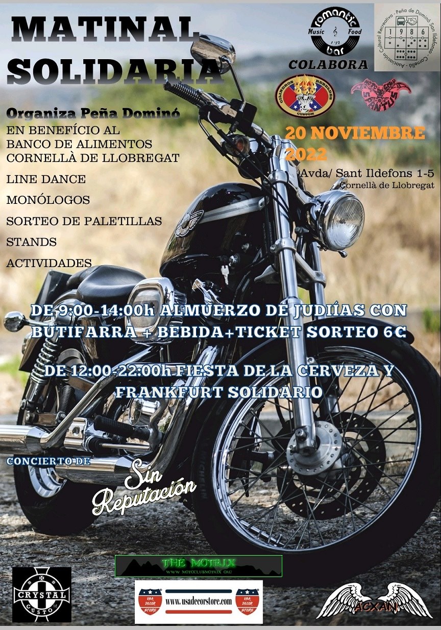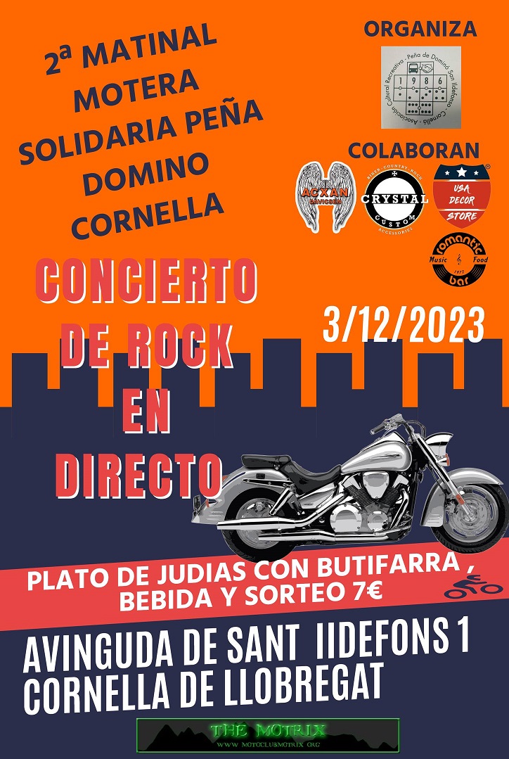 2ª Matinal motera Solidaria peña Domino de Cornellá ,desde las 9'00h y hasta las 15'00h , donde nos ofrecen un almuerzo de cuchillo y tenedor a base de judías blancas con butifarra y la bebida también el numero para el sorteo por solo 7€ , en los sorteos nos podemos llevar algún jamón y alguna sorpresa mas. La mañana será amenizada con un concierto de Rock en directo para que mováis los esqueletos a buen ritmo,