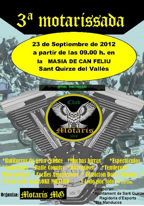 Muy criticable el hecho de que no cumplieran prácticamente con nada de lo anunciado en el cartel. Para empezar, nada de megabotifarras,..... Tan pequeñas que no llegaban de punta a punta de un panecillo de Viena. Eso sí, de excelente calidad. El Rom Cremat debieron dejarlo para postre del motogrup cuando acabasen la paella del mediodía. De coches americanos ni rastro, así como los juegos moteros que prometían.... entendamos que la chabacanada que montaron para regalar dos jamones no fue un juego motero.... A saber...