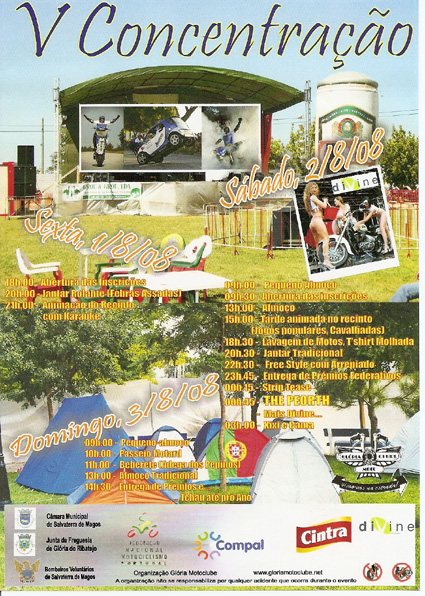 Este ano vai ser em Agosto a 5º Concentração Motard do Gloria Moto Clube, a ter lugar nos dias 1,2 e 3 de Agosto de 2008. Com o espaço ligeiramente renovado devido a extinção de Pista dos Barrancos, vamos ter um programa que vai ser do agrado de todos.