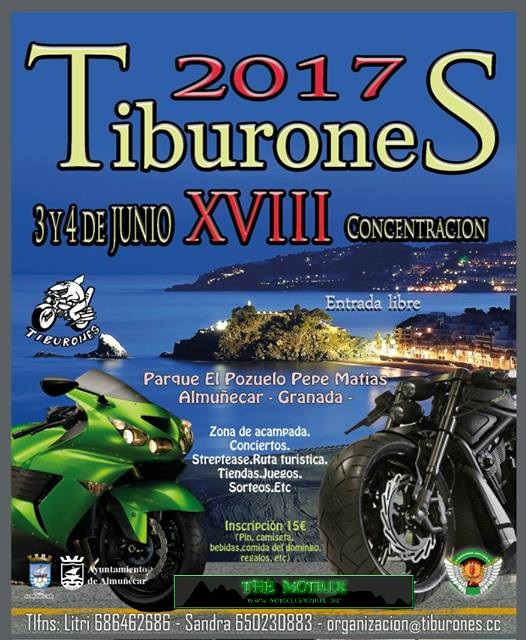 Domingo: Apertura de inscripciones,bolsa de bienvenida,pin,camiseta,ruta turísticatiendas,mucha cerveza,entrega de trofeos,sorteo de regalos y lo mejor de todo,el fenomenal ambiente motero de siempre. Los Tiburones os esperamos en Almuñecar!!.