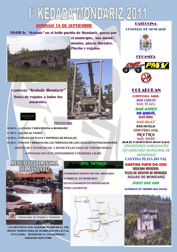El próximo domingo 18 de septiembre vamos a realizar una Kedada Moto-turística en Mondariz Pueblo, os adjunto el cartel en donde figura el programa. Los comerciantes de Mondariz, así como la Concellería de Turismo se han volcado en patrocinar una gran Kedada para todos los moteros, mostrarnos las bellezas del municipio, obsequiarnos con una gran pincho y por supuesto camiseta del evento para todos los asistentes. También habrá sorteos y regalos, y lo más importante es que no tengamos que hacer inscripción alguna, que el hacer turismo y dar paseos en nuestras motos no nos suponga más gasto que el de la propia gasolina.