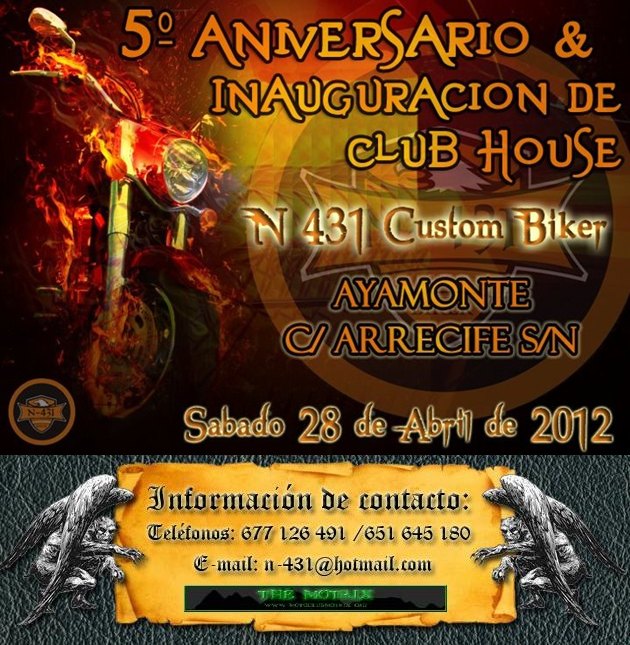 N-431 Custom Biker quiere invitar a todos los moteros a pollo al ajillo para celebrar todos juntos un momento tan especial en su cuarto aniversario. Te esperamos en el Bar La Raya de Aljaraque, después del pollo al ajillo con patatas dos conciertos de Rock en directo a cargo del grupo de metal onubense Sailens y el grupo de rock ayamontino Black Jack, streptease, detalles y regalos, plancha, música y mucha fiesta.