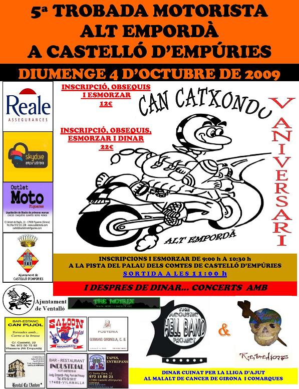 Encuentro, desayuno e inscripciones de 9 a 10:30h en el palacio de los condes de Castello d'Empuries ( Girona ) , a las 11 saldremos a rutear y pararemos a tomar un aperitivo en VENTALLO ( esto no lo pone el cartel) , La comida sera servida como cada año por la asociación de ayuda a los enfermos de cancer de nuestra zona, con quienes colaboramos desinteresadamente. Despues de la comida, y para celebrar nuestro V aniversario tendremos dos conciertos, uno acustico y otro ... Como vereis se trata de pasar un dia entre amigos, y a pesar de los impedimentos y la dificultad de montar un evento a un precio razonable por nuestras tierras (aqui cobran por todo) , creo que por quinto año consecutivo lo vamos a lograr . Ahora solo queda encomendarse al "Dios sol" y a la "madre Tramuntana" para que se dignen respetarnos en esta fecha tan señalada.